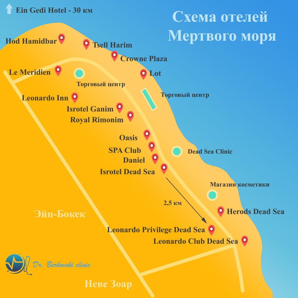 Побережье Мертвого моря, расположенного на 400 метров ниже уровня мирового океана, — самое низкое место на поверхности Земли. Воды Мертвого моря — настоящая кладовая минеральных веществ. Вдоль пустынных, местами скалистых берегов расположено большое количество термальных источников и залежей лечебных грязей. Все это, в сочетании с прекрасным солнечным сухим климатом и чистым воздухом, делает побережье Мертвого моря курортом мирового значения.